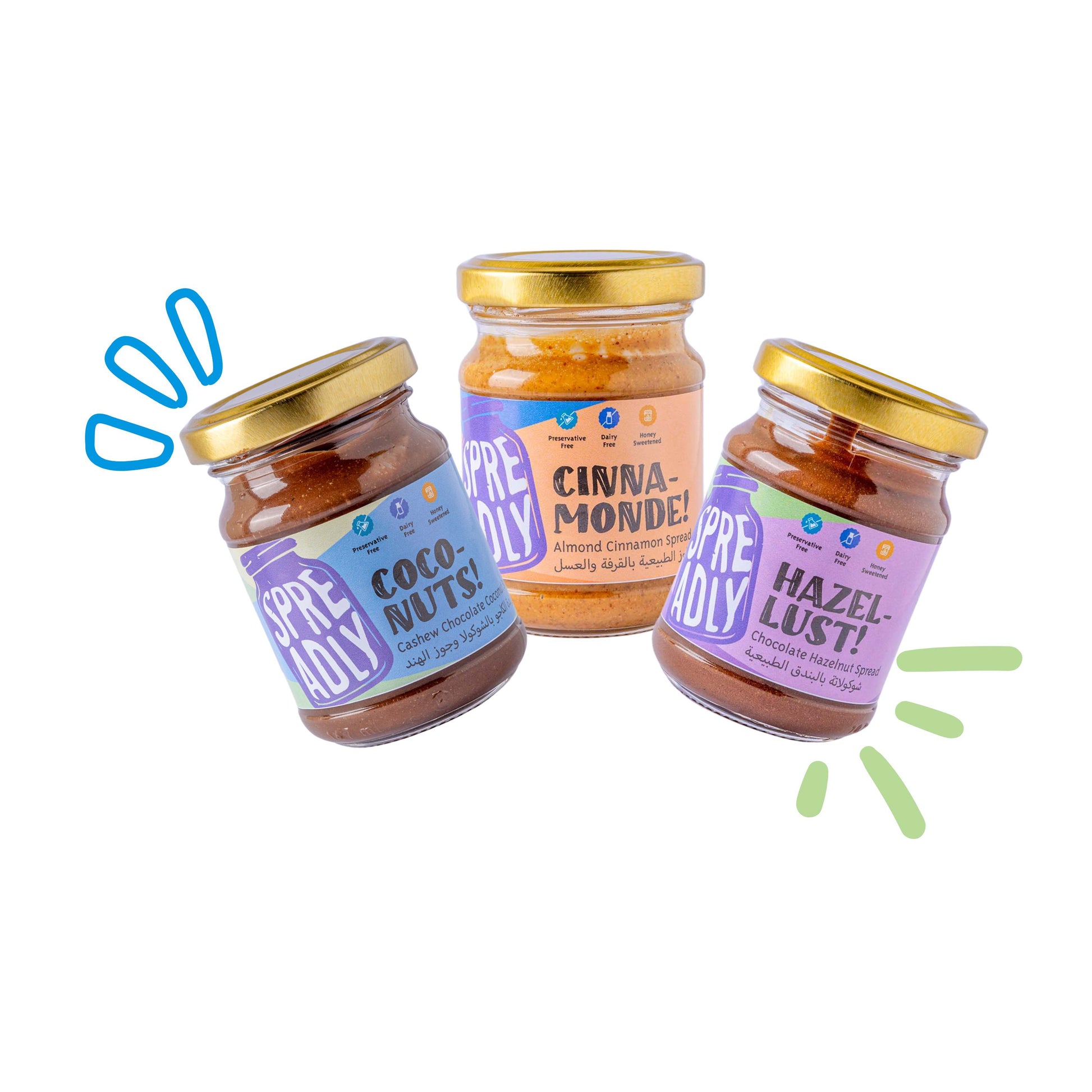 زبدة اللوز بجوز الهند + زبدة البندق بالشوكولا + زبدة اللوز بالقرفة